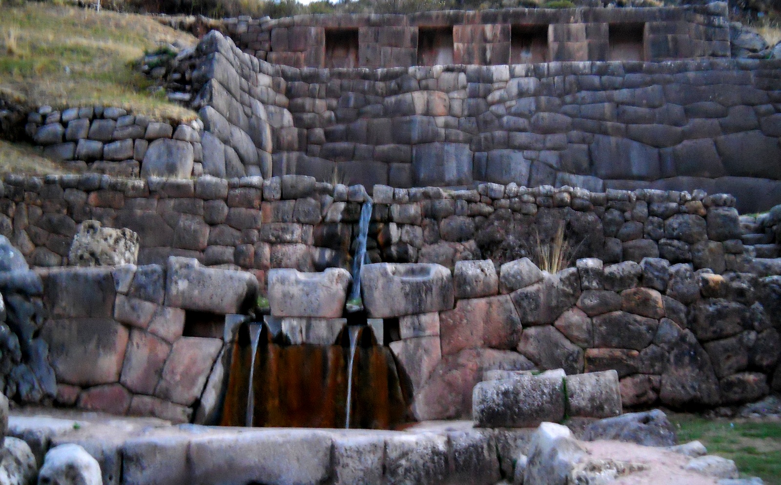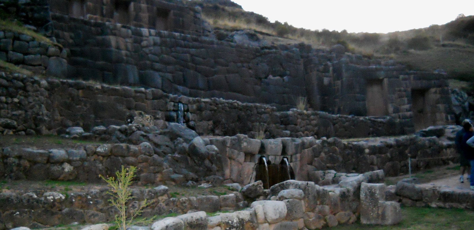 De Q’enqo, fomos à Tambomachay, que era uma estrutura para adoração da água, por isso possui muitas fontes. Fica a cerca de 8 km de Cuzco. Da entrada do local até as fonte de água, há uma subida de uns 500 metros. Devido a altitude, o cansaço é muito maior que o habitual.