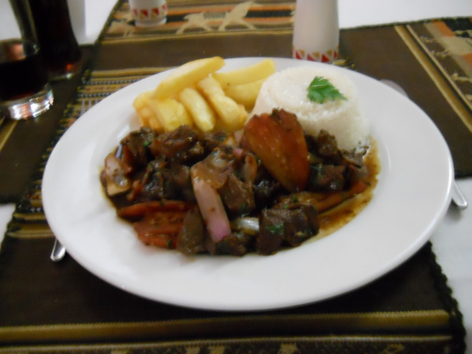 Mais tarde, comi um rango muito bom, feito com carne de alpaca. Quem vem ao Peru, não pode deixar de comer também o Lomo Saltado, que para mim, foi o melhor rango aqui até agora.
