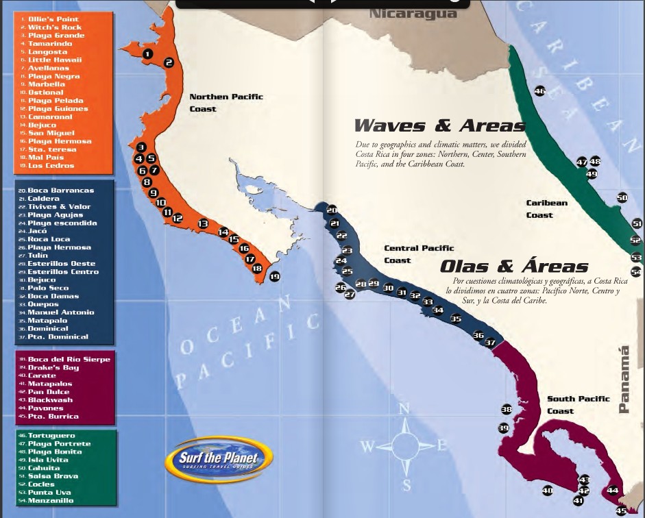 Assim que retornei da surf trip no Peru, já comecei a pensar na próxima viagem, e o destino que estava no meu radar já havia um tempo era a Costa Rica. Ano passado eu havia conhecido um argentino chamado Matías Guzman, que é um dos autores do melhor suf-guide da Costa Rica e que agora vivia na Praia do Rosa administrando uma pousada. Comprei diretamente com ele o guia e depois de algum tempo já tinha o decorado de cabo a rabo e sabia praticamente de cor todos os picos de surfe, suas características, melhores épocas, tudo !