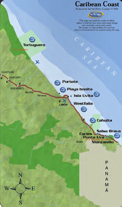 O lado caribenho tem um ambiente tipo “jamaican style” que o torna bem diferente do resto do país. As pessoas são diferentes, as construções são diferentes e alguns costumes também, como por exemplo dos hastafaris, que em lugares como Puerto Viejo, falam em Patua, um dialeto parecido ao inglês, similar ao que fala na Jamaica. É um ambiente mais cool e relaxado. O surfe é quase todo em fundo de corais e nesta região quebram algumas das melhores, mais exigentes, mais fortes e perigosas ondas da Costa Rica.