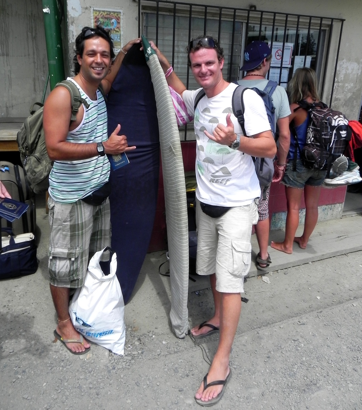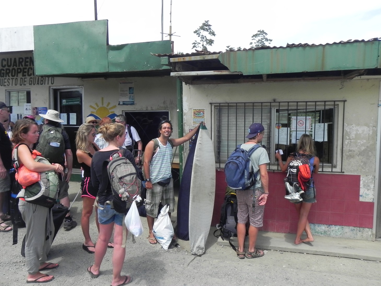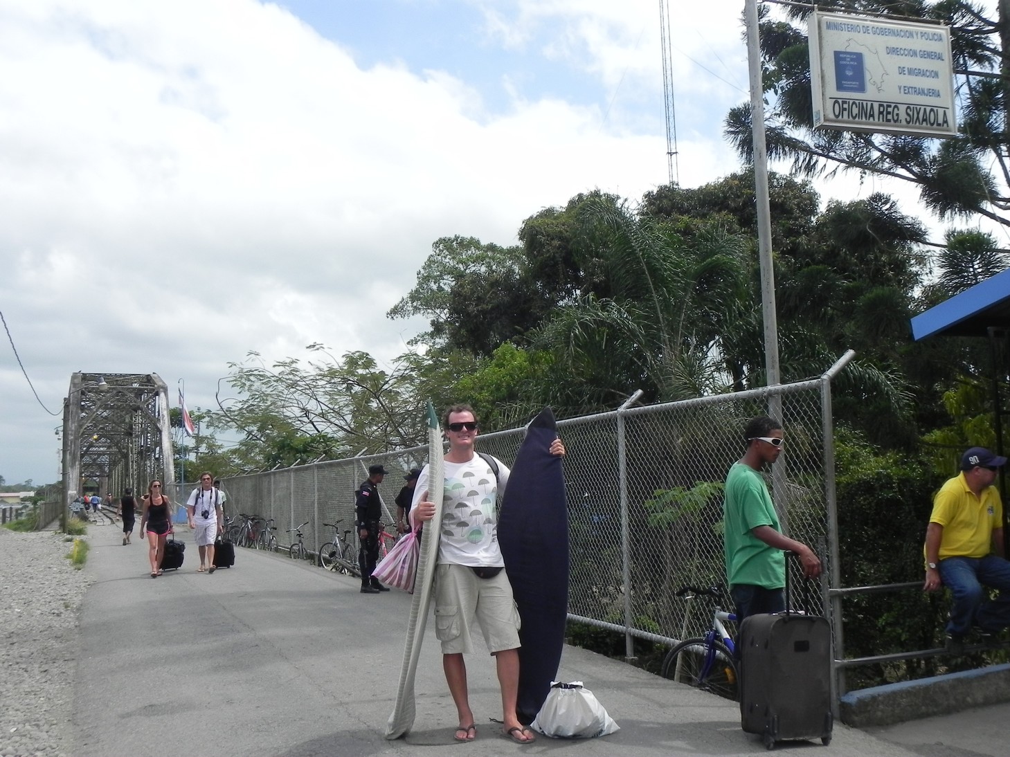 Sixaola, na CR. Fomos até lá apenas com uma prancha e uma mochila de mão (o resto das bagagens deixamos no depósito da pousada em Puerto Viejo) e nos apresentamos no ali neste escritório de fronteira, ao lado da ponte. Neste local, eles carimbam o passaporte com a saída da Costa Rica e em seguida atravessamos a pé a ponte até o posto do Panamá no outro lado. Então carimba o passaporte com o registro de entrada no Panamá, passa na fiscalização agropecuária e esta feita a imigração!