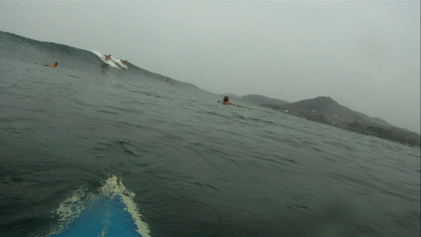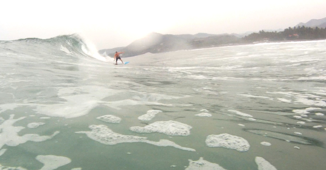 Ontem pela manhã, exploramos um outro pico aqui da região, chamado El Zonte. Para ir para esse pico, pegamos um buzum aqui na estrada, apenas com a prancha debaixo do braço e umas moedinhas no bolso, que nem a gente fazia lá em Punta Hermosa para ir para Punta Rocas. Pegamos ótimas ondas, com apenas eu, o Denis e um local na água.