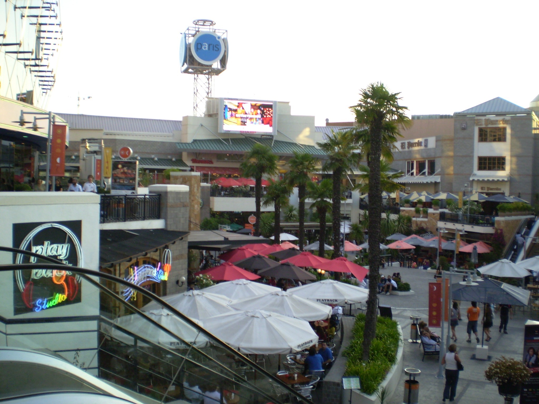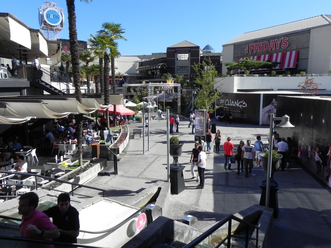 Ao ar livre, entre os blocos gigantescos de lojas do shopping, ele reúne restaurantes de grandes redes, cafés, docerias, cinemas, teatro, boliche… Há um palco com shows ao vivo, ao redor do qual famílias, grupos de adolescentes e turistas se reúnem…