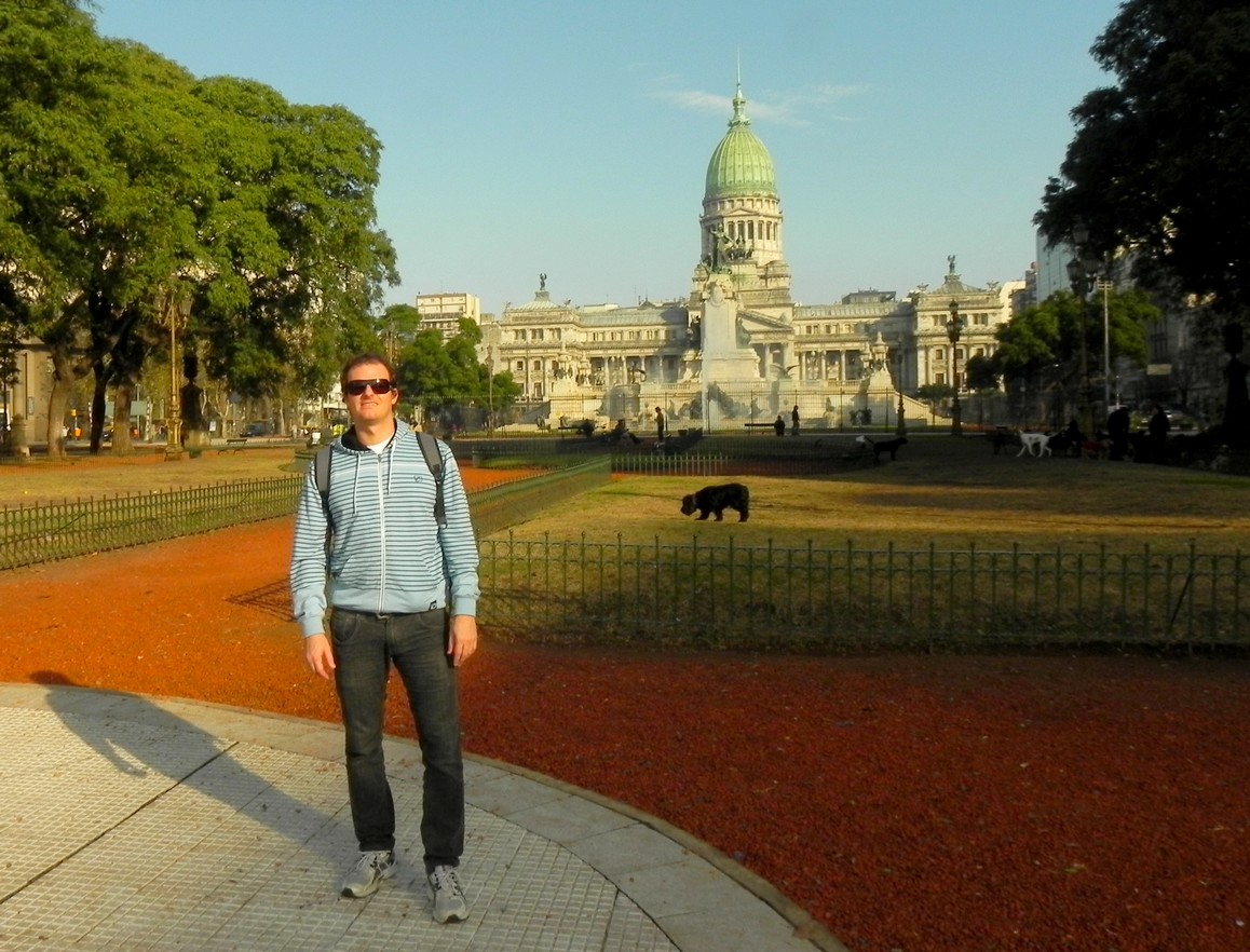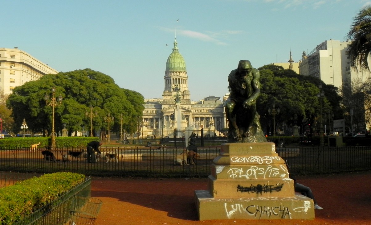 Pegando a Av. de Mayo à direita, mais 4 quadras cheguei na Praça do Congresso, onde encontra-se o Congresso dos Deputados, que abriga a Camara dos Senadores e Congressistas. A praça do Congresso foi desenhada pelo arquiteto paisagista francês Carlos Thays, responsável pelo traçado de importantes espaços verdes da Cidade, como o Parque Tres de Febrero e a praça San Martín. Foi inaugurado durante as comemorações do centenário da revolução independentista de maio de 1810. Aqui na praça do Congresso também está uma das oito cópias originais do Pensador de Rodin, feitas antes de destruir o molde.