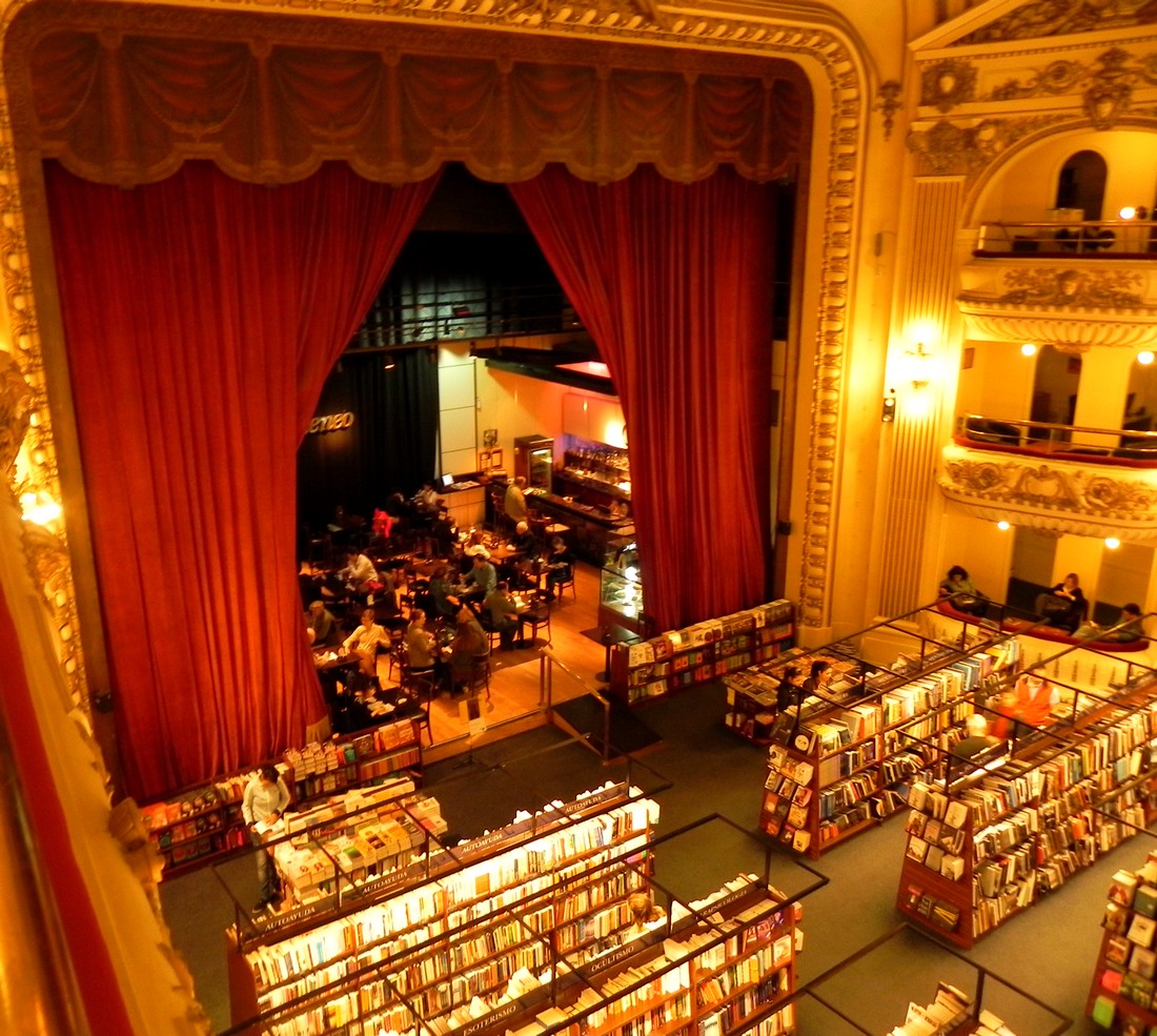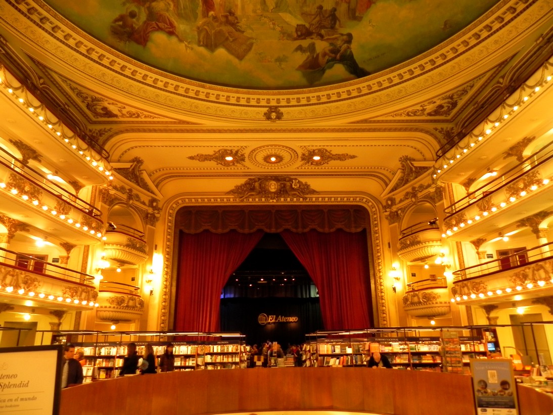 Da Estação Retiro, peguei a Av. Santa Fé e caminhei até a Livraria El Ateneo. A livraria El Ateneo se encontra no antigo teatro Grand Splendid fundado em 1908. Restaurado, o local manteve a grandiosidade clássica, com seus balcões e camarotes , em uma área de 2 mil metros quadrados, que abrigam 60 mil títulos e puro glamour. Ali, os visitantes podem ler um livro tranquilamente em um dos antigos camarotes ou no café da própria livraria, instalado no palco do antigo teatro.