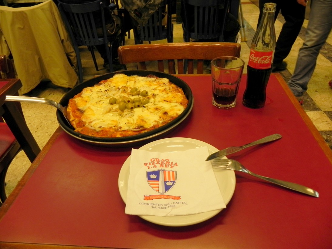 Voltei para o Hostel, dei uma descansada e saí novamente para jantar na Corrientes. Comi uma pizza maravilhosa na Pizzeria La Rey, quase ao lado do Obelisco, bem em frente ao Teatro Nacional. Por sinal, é incrível a quantidade de teatros que há na Corrientes. É um atrás do outro, todos enormes e todos bombando !!