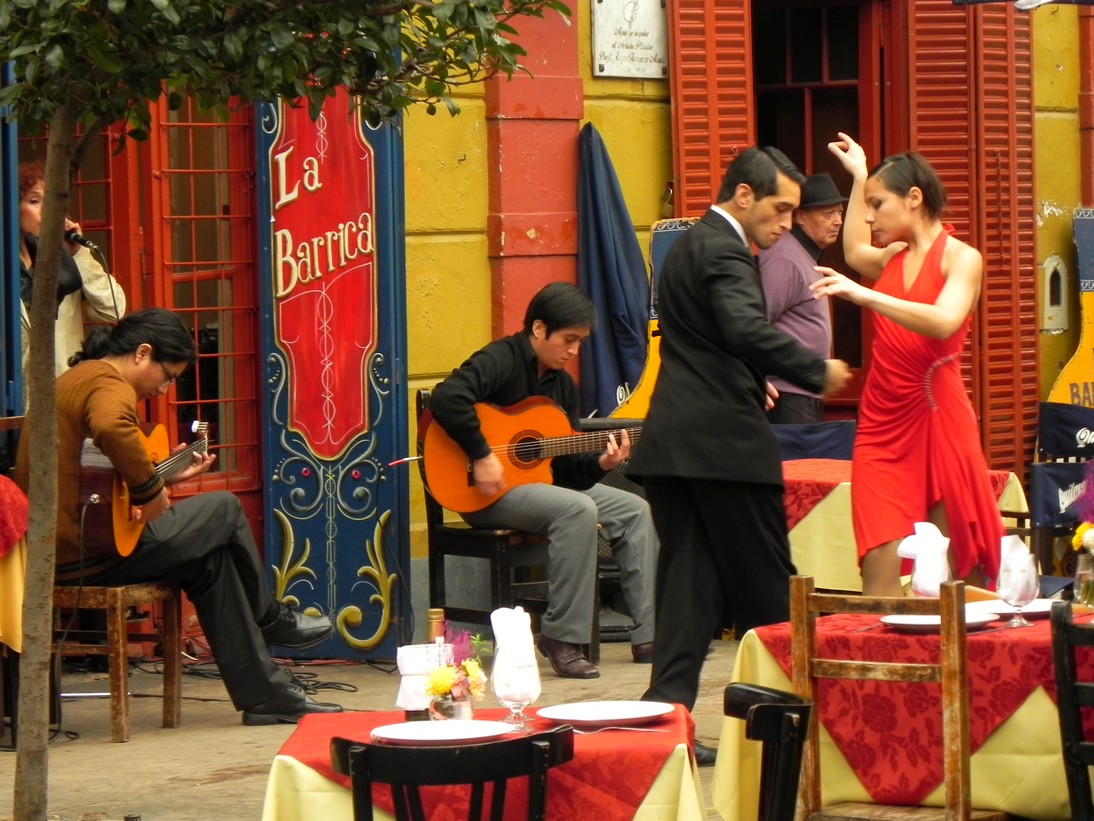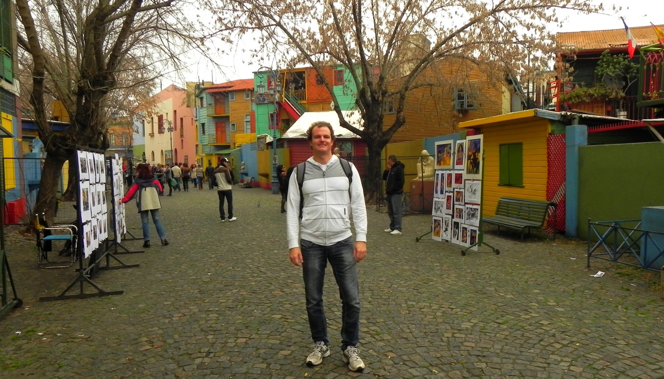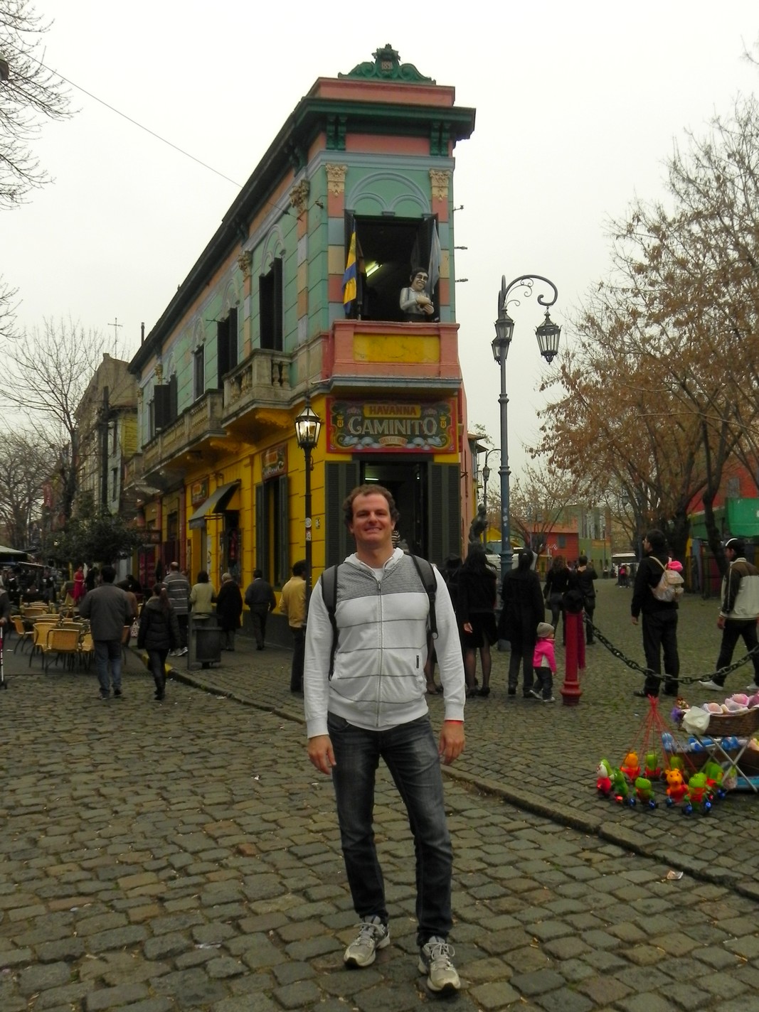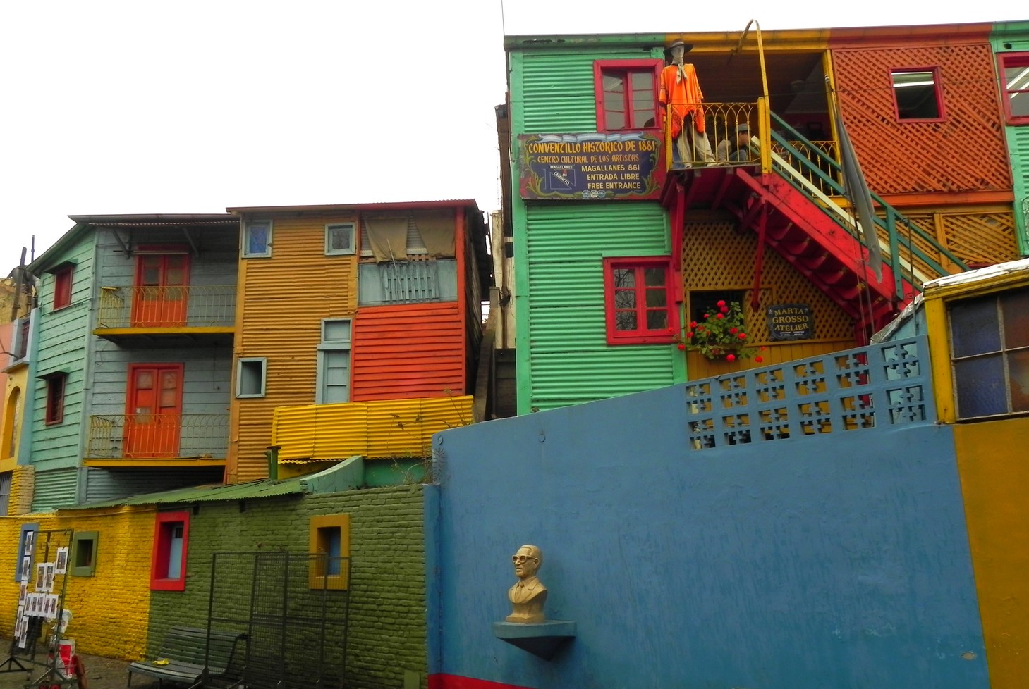De San Telmo, peguei um táxi e pedi que me deixasse no Caminito, no Bairro La Boca. Adentrando ao bairro, o taxista, que era muito gente fina, me chamou a atenção para algo peculiar da área … a maioria das calçada e das casas eram construídas a mais de um metro de altura em relação ao nível das ruas. Realmente parecia bastante estranho, pois os carros quando estacionavam nas ruas, os caroneiros não tinham como sair pela sua porta, tendo que sair pelo lado do motorista, uma vez que a calçada era praticamente um muro ao lado dos carros. O taxista então explicou, que os moradores começaram a elevar as calçadas e as casas por causa de um fenômeno natural que costumava ocorrer na área.. Quando ocorriam as “sudestadas” no Rio da Plata (fortes correntes e ventos de sudeste), o mesmo elevava-se de nível e impedia que o Rio Riachuelo desaguasse nele. Por fim, o Rio Riachuelo acabava transbordando e alagando todo o bairro. Devido a isto também os torcedores do Boca Juniors são chamados “carinhosamente” de “bosteros” pois as casas do bairro eram invadidas não só pelas águas do Riachuelo, mas também pelas bostas de cavalo que as águas do rio espalhava … Hoje em dia, este problema não ocorre mais no bairro, devido a obras de contenção que foram realizadas nas margens do Riachuelo e Rio da Plata.