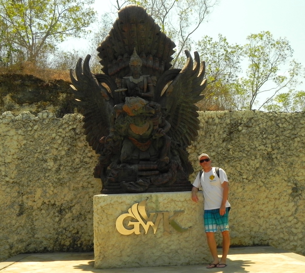 Começamos o rolê por Jimbaran, no parque cultural GWK (Garuda Wisnu Kencana). O templo é dedicado ao deus hindu Vishnu, e sua montaria, Garuda, o pássaro mítico que é sua companheira. Tem uma estátua enorme do Vishnu, de 23 metros, outra irada também da Garuda.