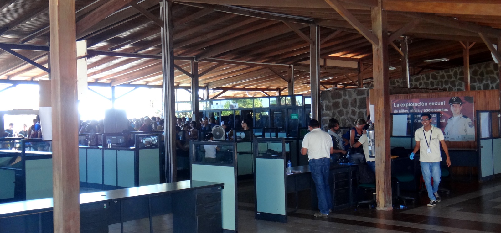Primeiro tem que entrar numa fila enorme, com apenas 2 guichês atendendo, para pagar uma taxa de 10 doletas referente a não sei o que, para apresentar no desembarque em galápagos. Depois entra em um outro filão para rastrearem todas as bagagens que vão para galápagos. Só depois que liberam para o chek-in para despachar a nossa bagagem. Uma fila e demora do cão .. as chicas da LAN mais perdidas que cusco em tiroteio, passando rádio para meio mundo para tentar acertar os embarques … uma confusão tremenda … mas no fim tudo dá certo e embarcamos em cima do laço para fazer o vôo Quito -> Guayaquil -> Galápagos (San Cristobal).