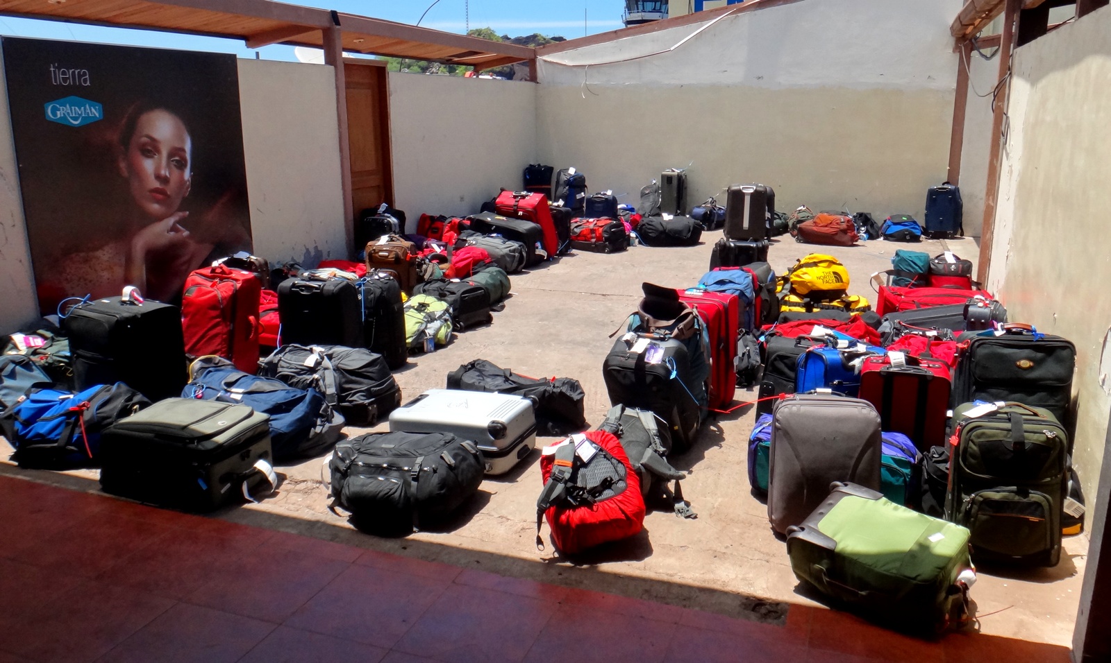 O desembarque é na pista e as malas ficamo no chão ao sol, aguardando para serem retiradas.
