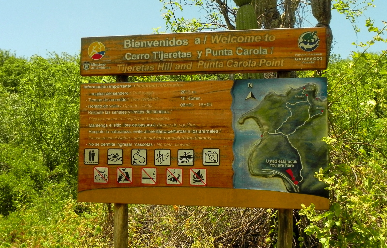 Através do Centro de Interpretacion, fomos nas trilhas que existem para ir até o Cerro Tijeretas, onde dá para observar os Piqueros Patas Azueles e Fragatas.