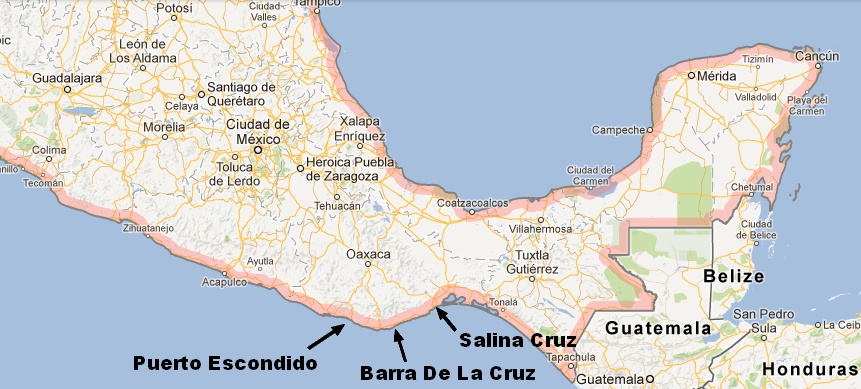 Como em 2012 eu já tinha agendada a trip para Austrália/Indonésia/Nova Zelândia no segundo semestre, pilhei a galera de fazermos a trip mexicana no primeiro semestre de 2013. Ficamos acertados então de começar os preparativos e organizar a logística no final de 2012. Nesta época, começamos a fazer alguns orçamentos e levantar informações sobre os picos de surfe e da logística para chegar até eles. Definimos que o foco da trip seria surfar os picos da região de Salina Cruz e ainda aproveitar alguns dias em Barra De La Cruz e Puerto Escondido. Todos estes localizados na região de Oaxaca, no sul do México, pelo lado do pacífico.
