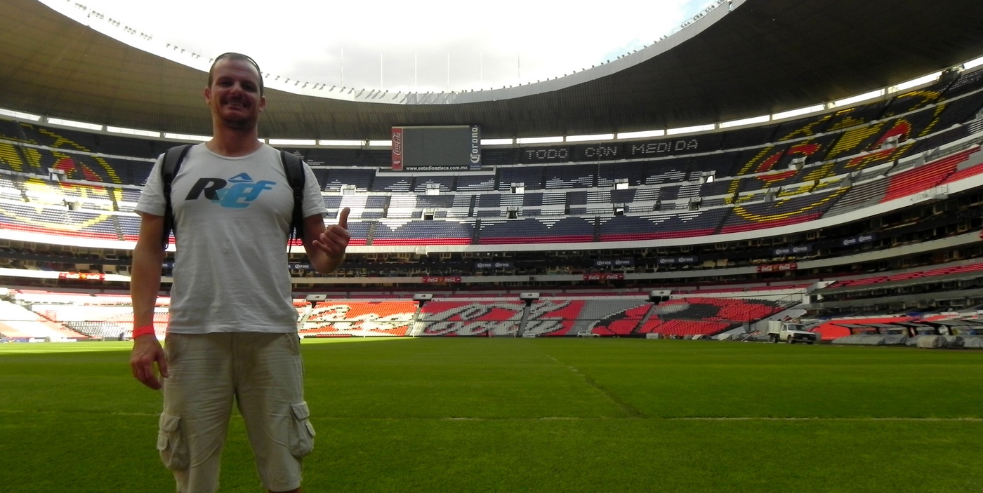 Após o rango, demos uma descansada no hostel e a seguir pegamos um táxi até o famoso Estádio Azteca, um dos templos do futebol mundial. O Azteca é o maior estádio do país e casa da seleção mexicana e do clube América do México. Sua capacidade é de 105 mil espectadores. Foi neste estádio que o Brasil foi campeão da copa do mundo de 1970, consagrando Pelé como “O Rei do Futebol”, e onde Maradona se consolidou como figura histórica do futebol mundial, ao fazer dois gols emblemáticos na copa de 86 contra a Inglaterra. Um ao driblar meio time inglês partindo desde o meio-de-campo e outro, o famoso gol de “La mano de Dios”. É o único estádio do mundo a sediar duas finais de Copa e é o estádio que mais recebeu jogos na história das copas.