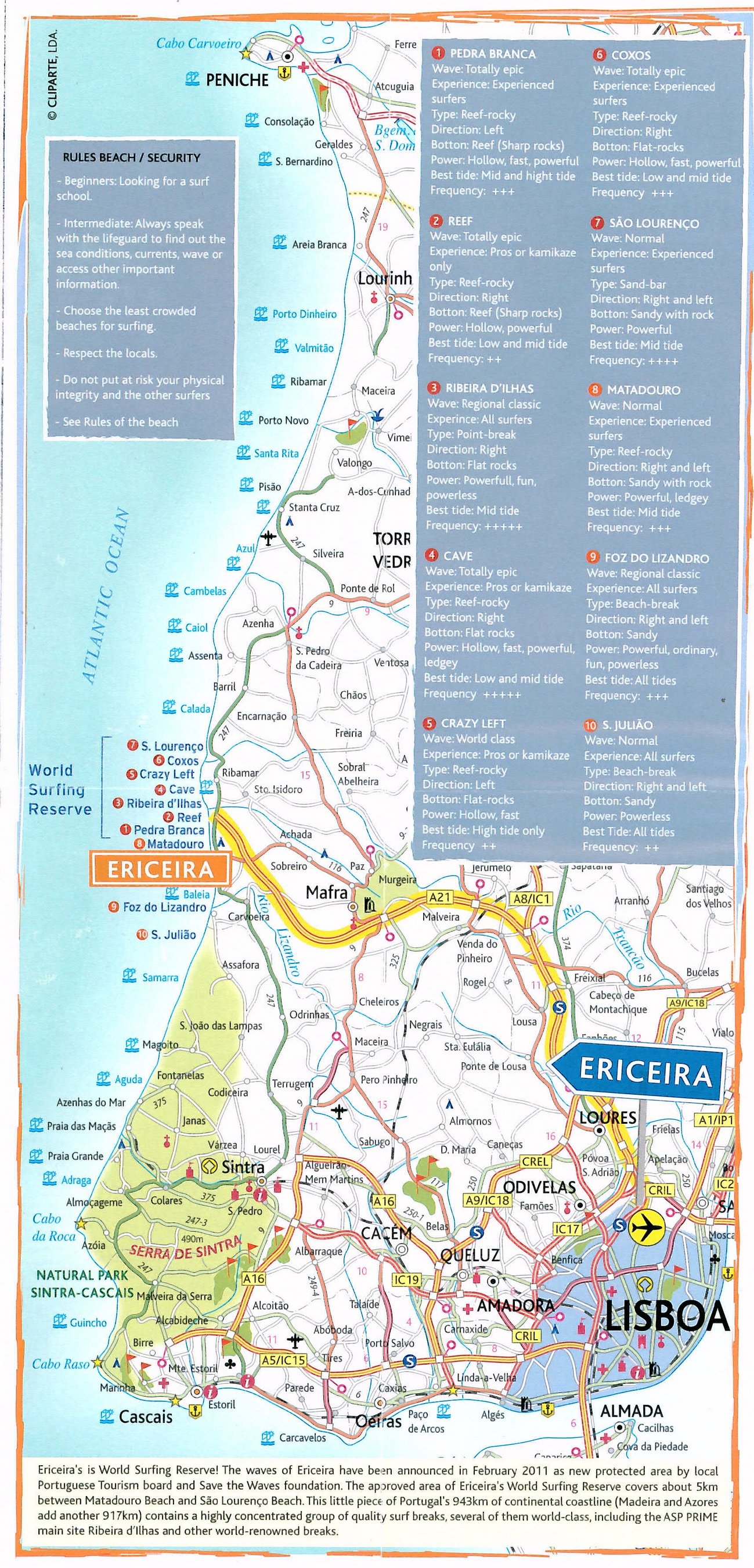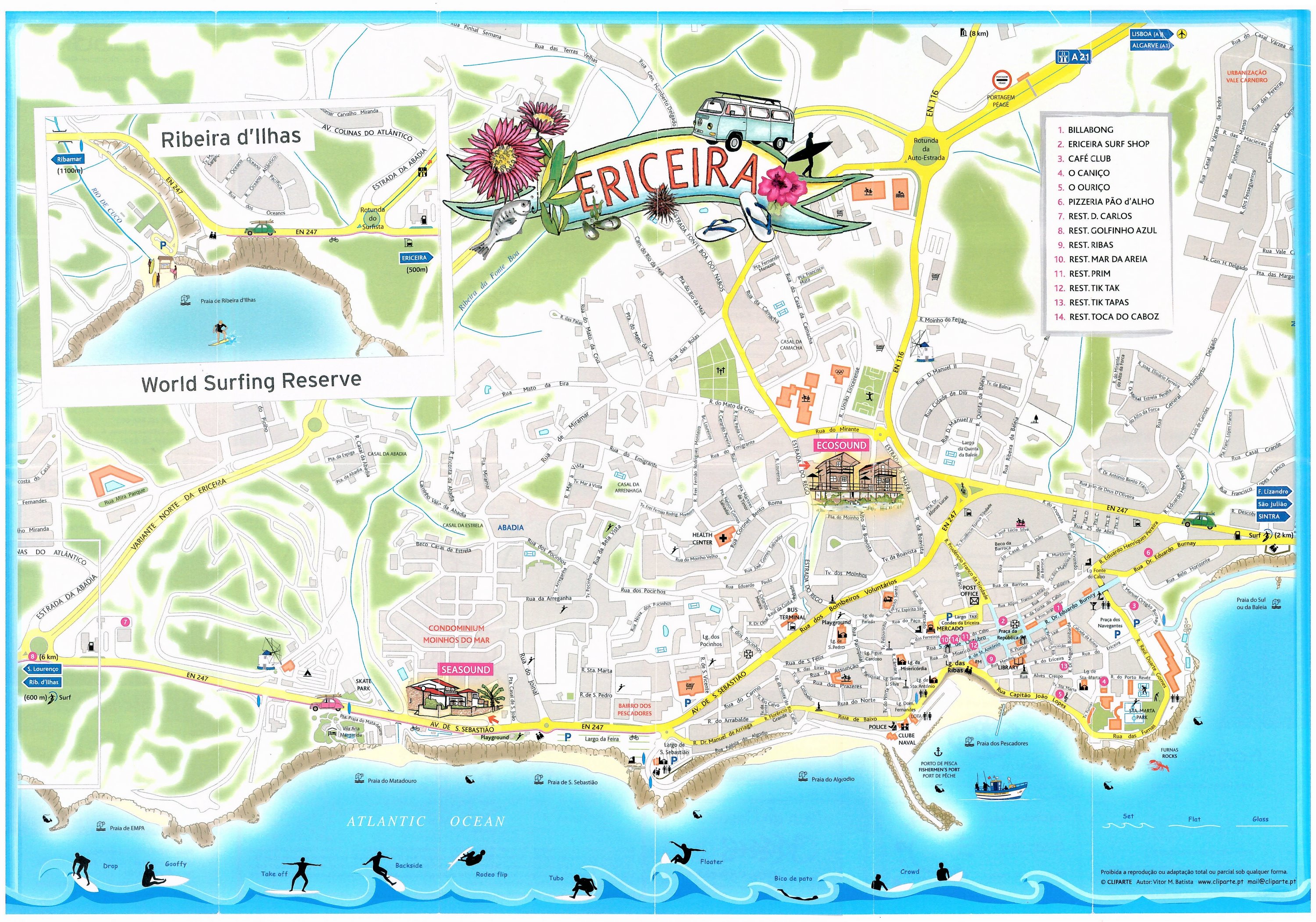Clicando nas imagens abaixo pode-se visualizar os mapas turísticos de Ericeira e características de algumas das principais ondas da região.