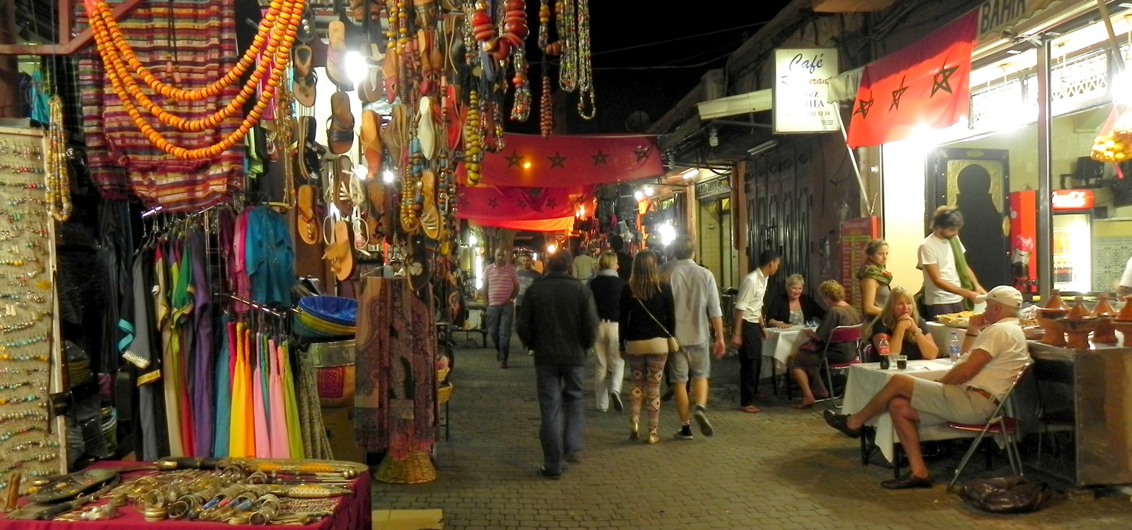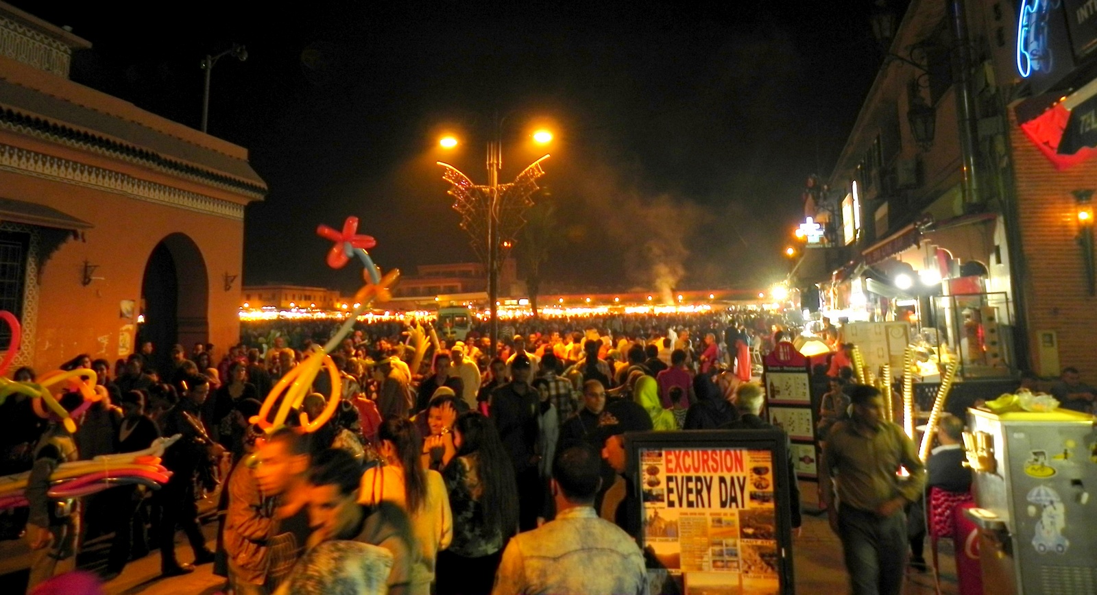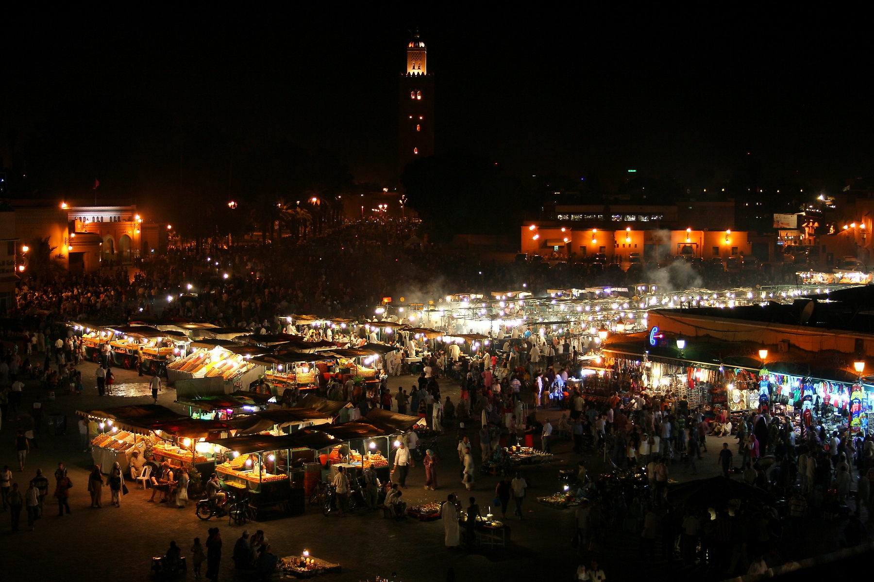 A praça Djema el Fna é o coração da cidade, onde encantadores de serpentes e barraquinhas de sumo de laranja natural a 50 cêntimos se confundem. É dali que se espalha o grande mercado central, o souk, que é enorme e onde se vende de tudo. Ao redor da praça existem muitos restaurantes com esplanadas panorâmicas. Vale a pena subir em algum, nem que seja para beber uma água (o consumo de bebidas alcoólicas é proibido no Marrocos!) ou comer qualquer coisa, somente para contemplar a praça com todos os seus personagens. Os marroquinos assediam muito os turistas, todos querem oferecer alguma coisa. Embora assuste um pouco, o povo é muito cordial e assaltos são incomuns. Vale, claro, ficar sempre de olho na mochila e não expor objetos de valor. A cidade possui boa infraestrutura turística e clima acolhedor aos estrangeiros, além oferecer roteiros nos arredores que vão desde um passeio à costa, visita aos picos nevados do Atlas ou dormir no deserto.