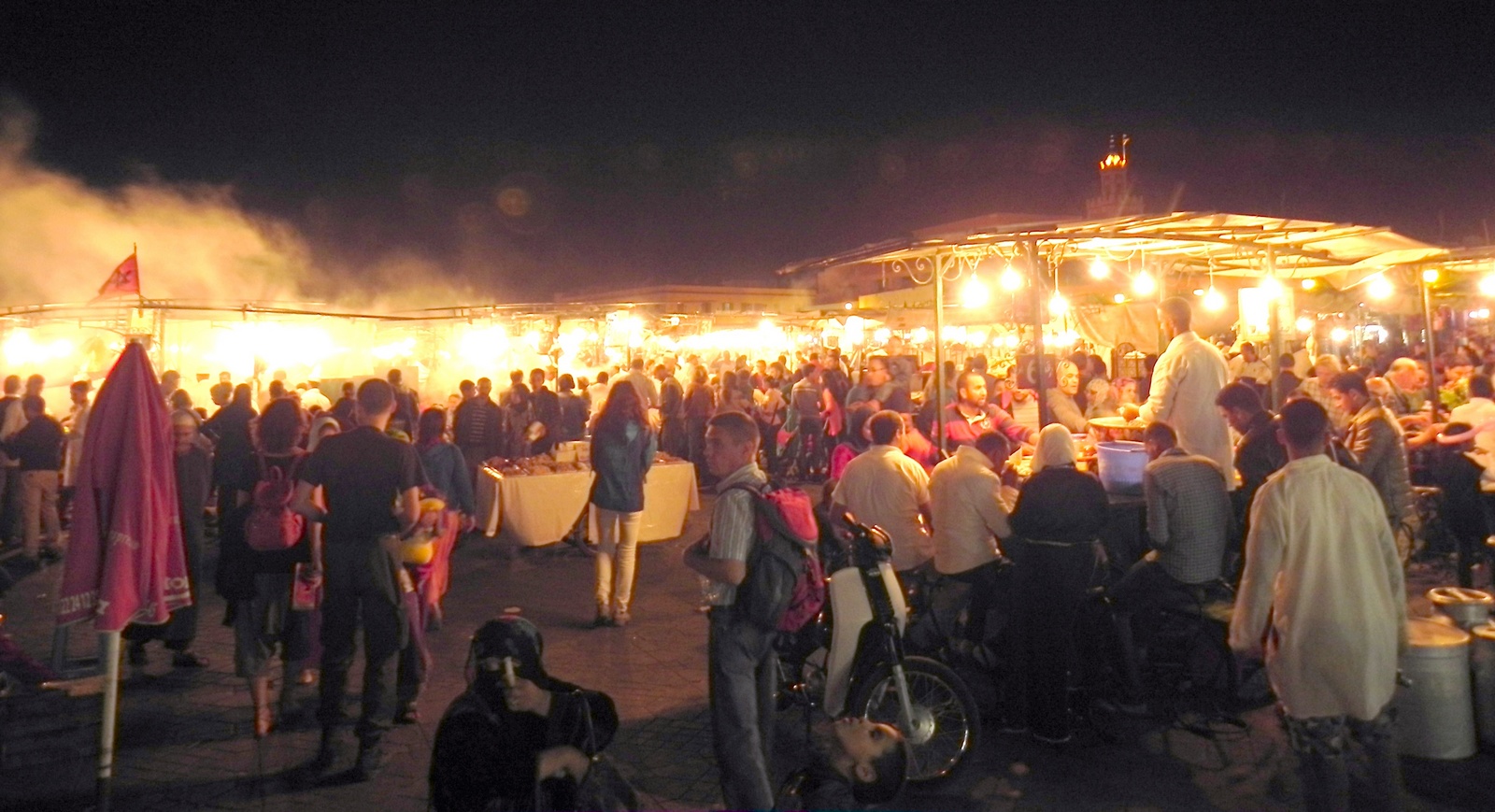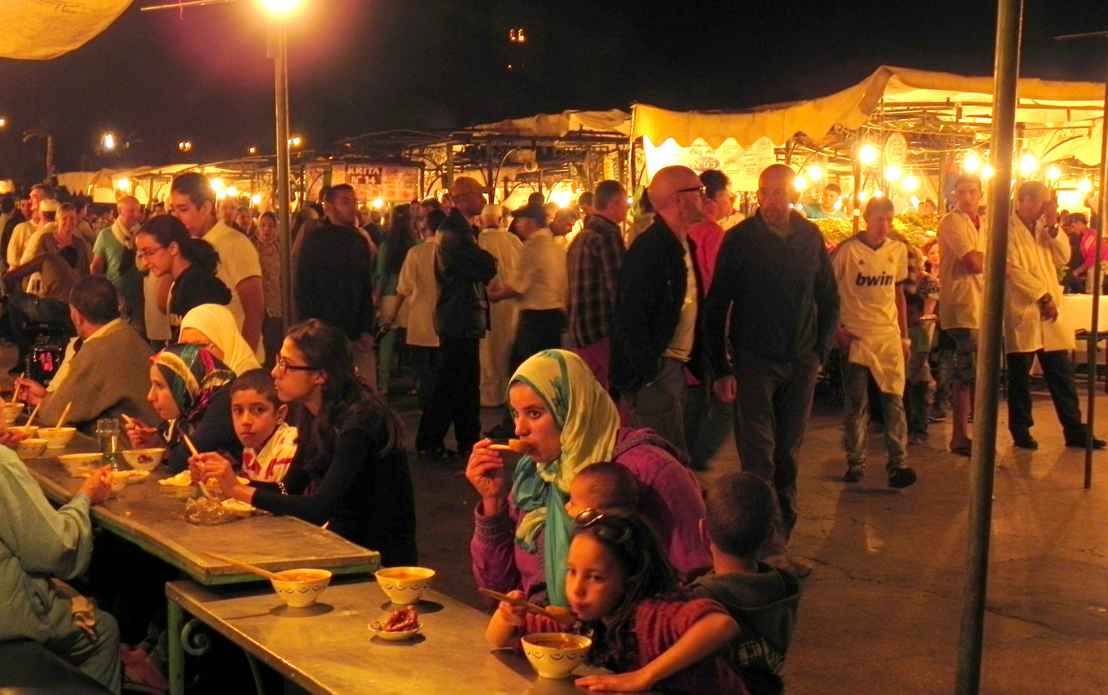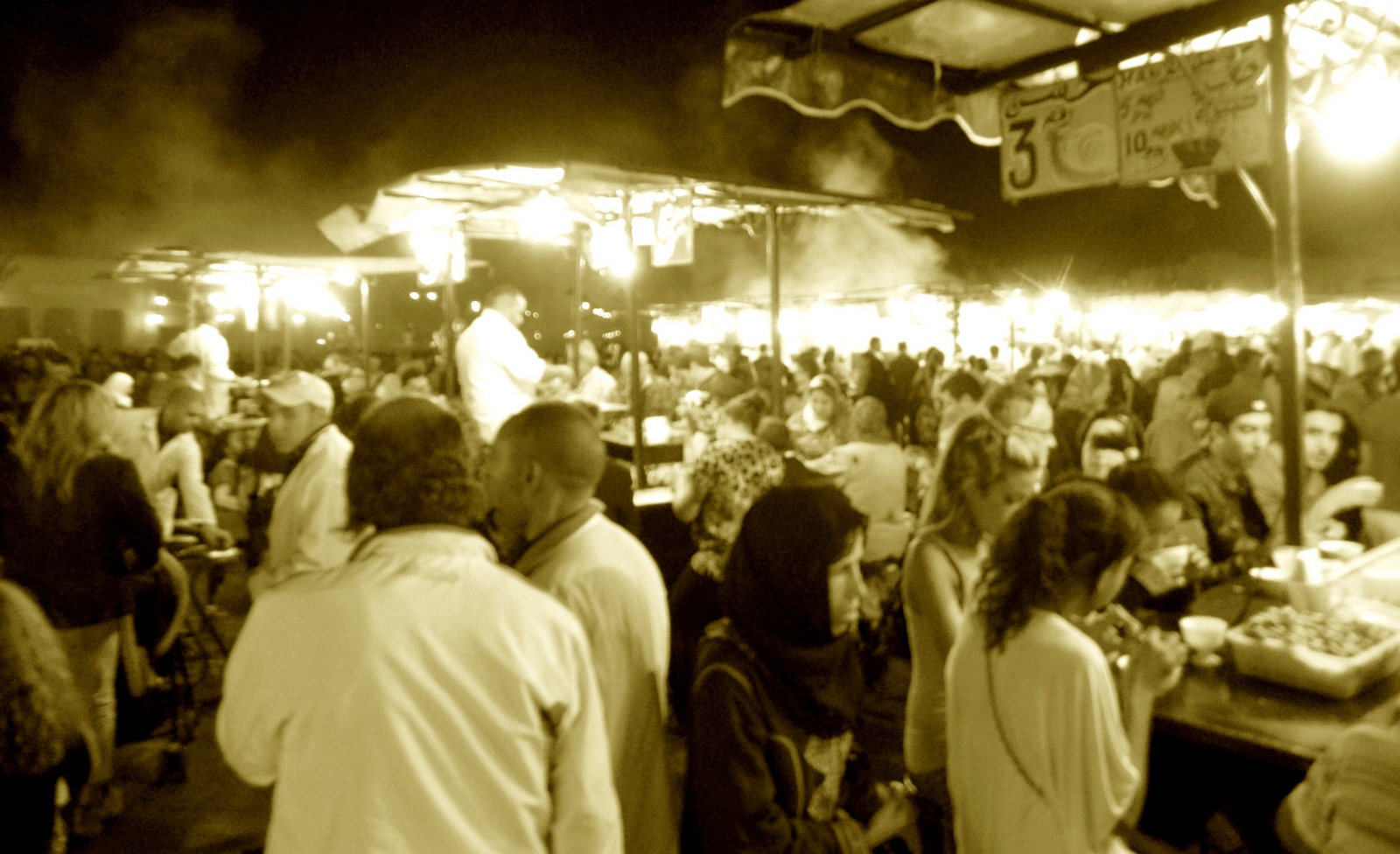 A praça Djema el Fna transforma-se no final do dia em um verdadeiro restaurante a céu aberto. À noite, são montadas dezenas de barracas de comida típica, onde os sabores da comida de Marrakesh são oferecidos, aos berros, para quem passa. As barracas dominam a praça, juntamente com centenas de turistas e locais. Bem a verdade, nem tudo é muito limpo e higiênico, mas acabei comendo por ali mesmo, e estava bem bom! Não morri e nem tive nenhuma dor de barriga. Aqui vale também aquela máxima de “se está cheio é porque deve ser bom”!