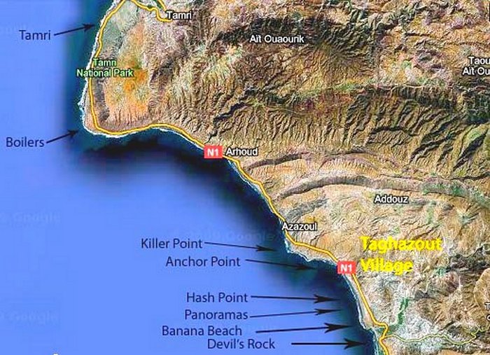 Dentre os principais picos da região estão: Anchor Point, Panoramas, Killers Point, Hash Point, Mysteries, La Source, Boillers, Tamri, Banana Beach e Devil’s Rock.