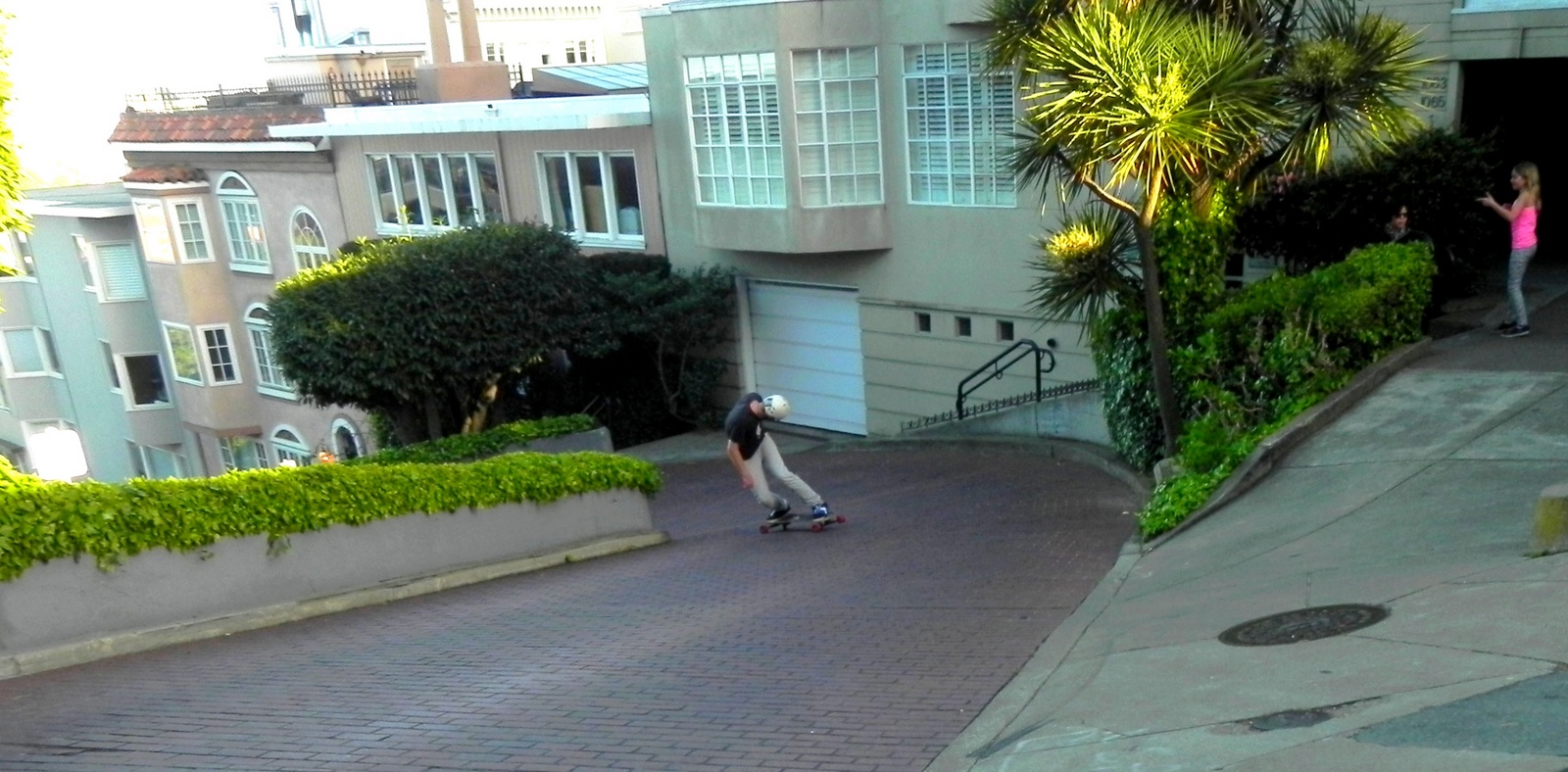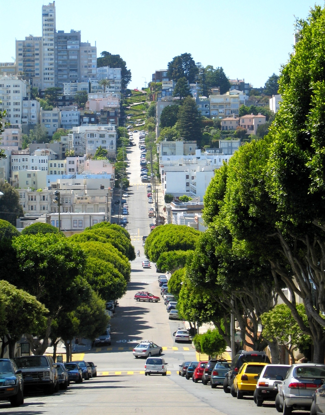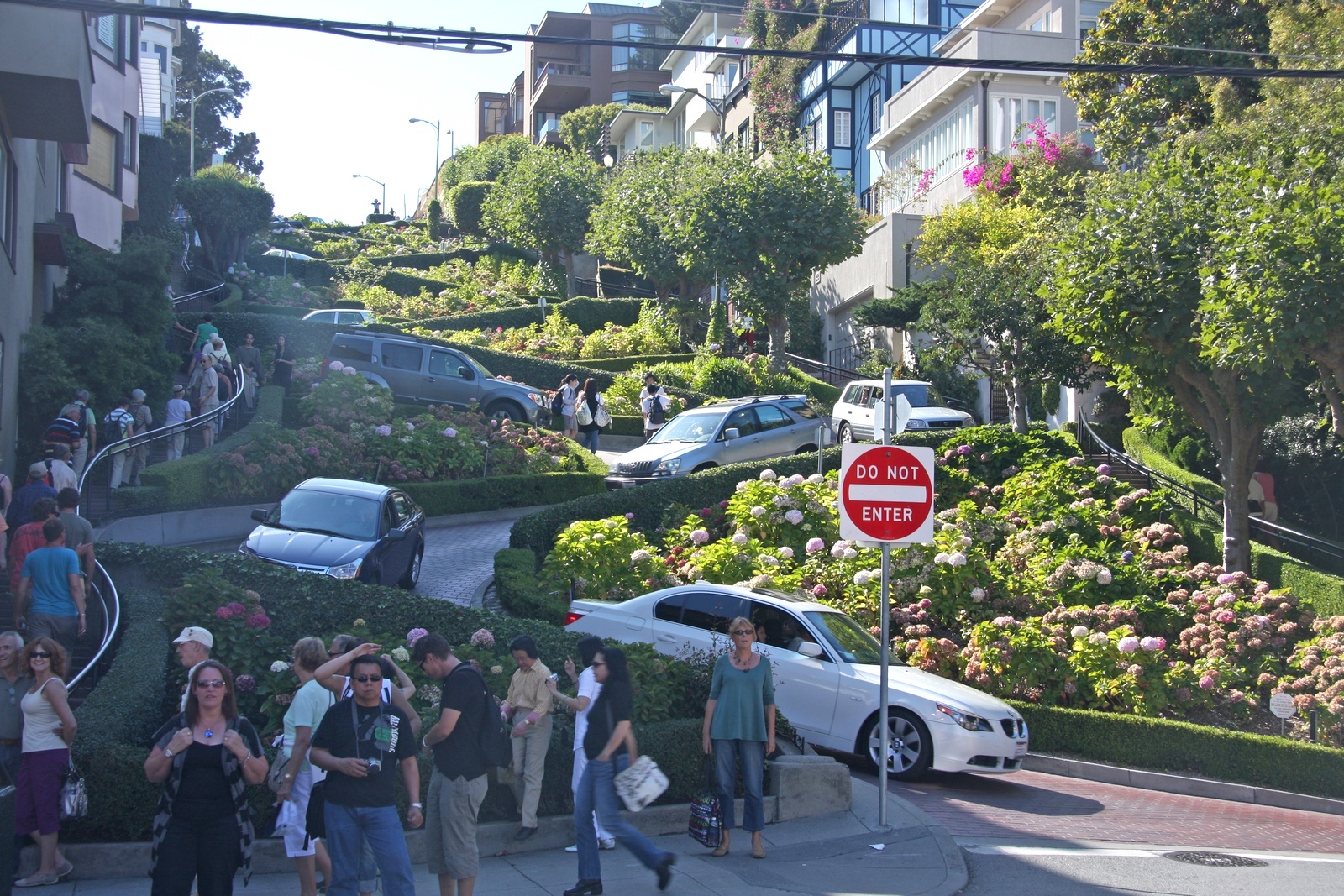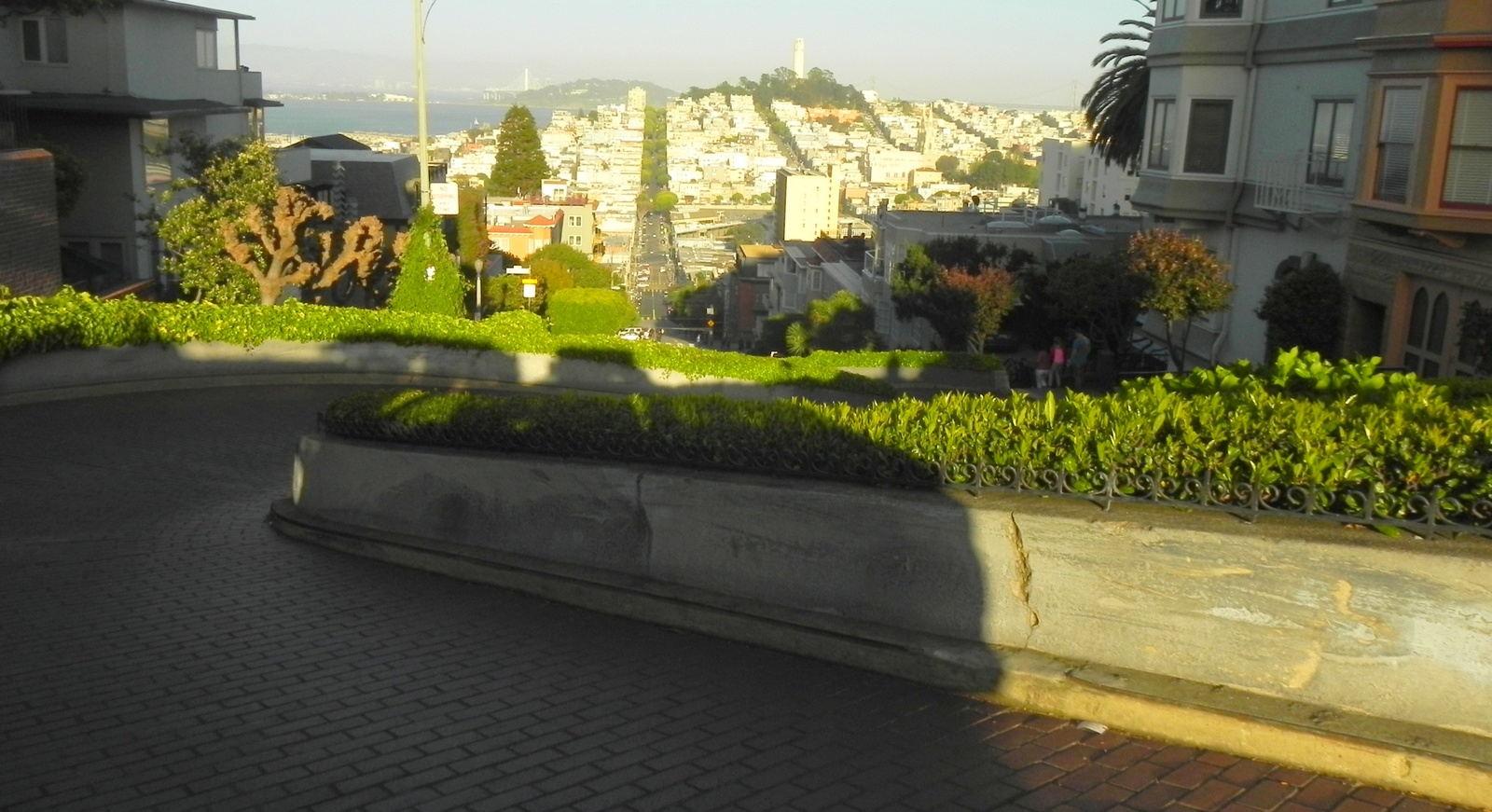 Fomos então até a Lombard Street, uma das ruas mais famosas de San Francisco, devido ao fato de em uma de suas quadras ser um ladeira extremamente íngreme pela qual se trafega em zigue-zague. O trecho conhecido mundo afora é a ladeira íngreme que fica no quarteirão entre a Hyde Street e a Leavenworth Street. Este trecho, de tão inclinado, não permitia o tráfego de carros até 1922, quando um dos moradores do lugar, Carl Henry, decidiu reformá-la para tirar a escada que havia ali e construir a faixa de rolamento de mão única em descida, tal como existe até hoje.