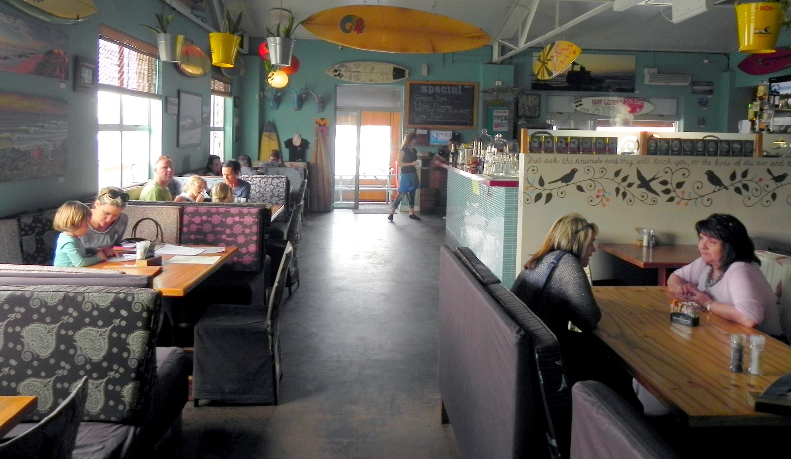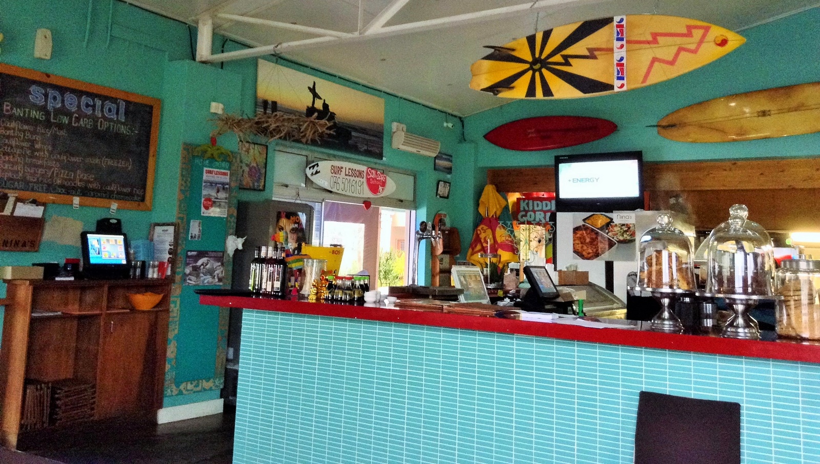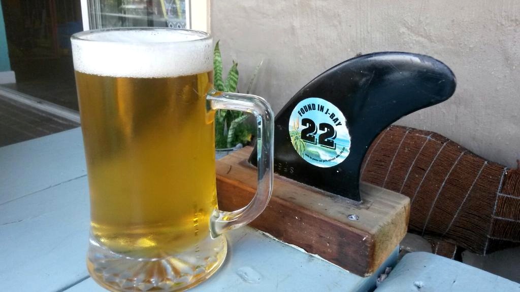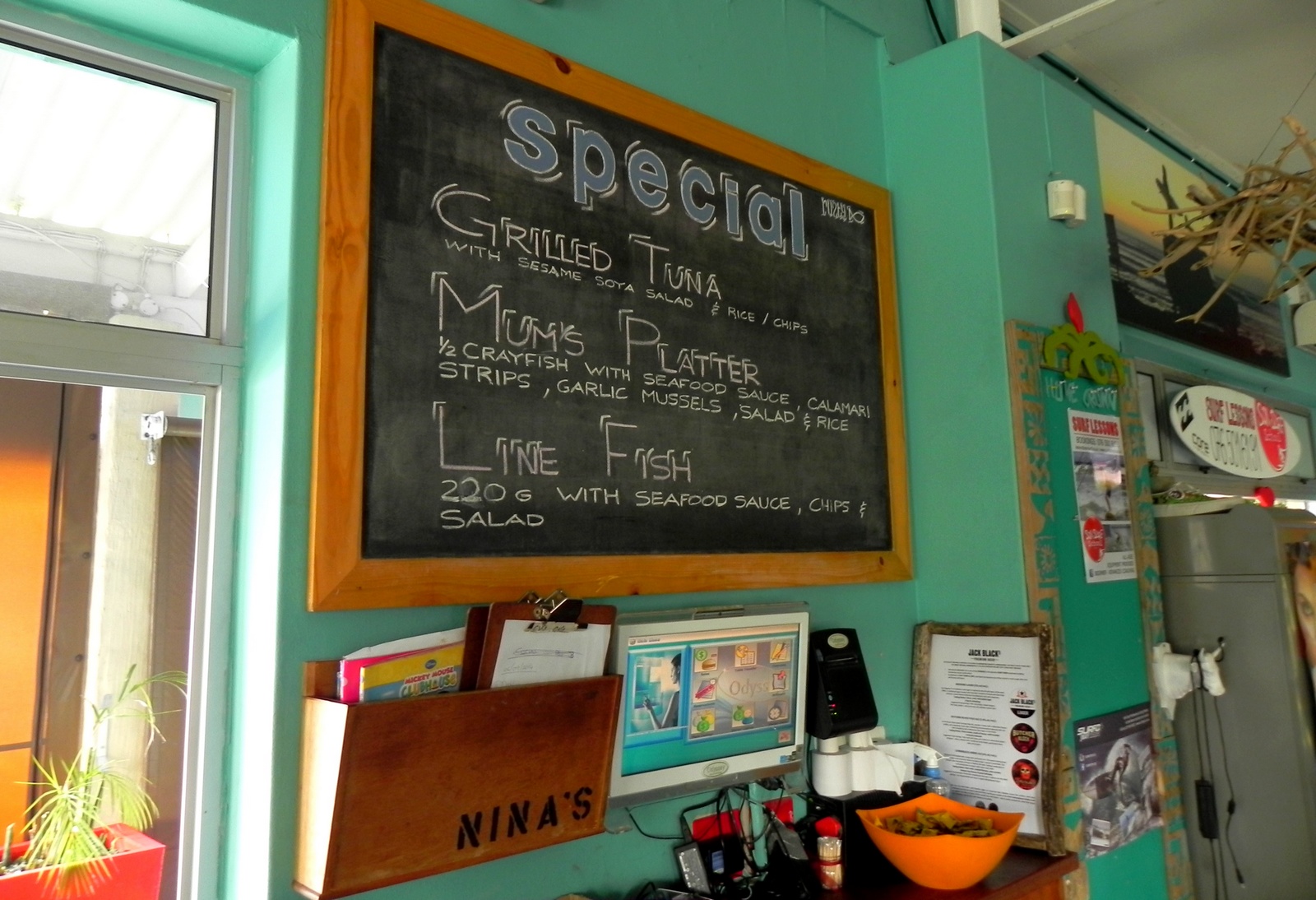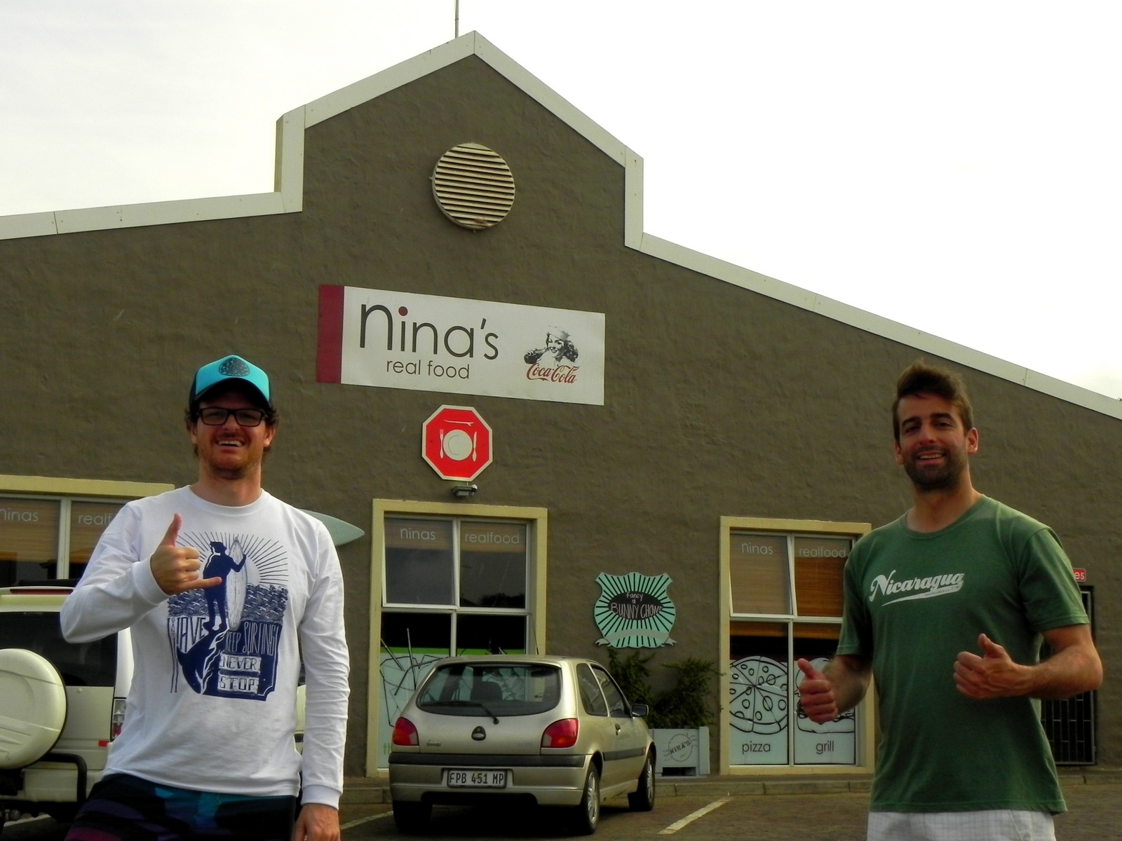 Neste dia, fizemos também uma descoberta importante em Jeffreys Bay: o restaurante Nina’s! Trata-se de um bar/restaurante na Gamma Road que é sem dúvida o rango mais confirmado de J-Bay! Lá eles servem diferentes tipos de café da manhã que você pode personalizar com o que deseja, uma variada carta de chopps e vinhos, pizzas maravilhosas, diversos pratos quentes espetaculares e um sorvete artesanal que é sacanagem! Além de a comida ser muito boa, o local tem também um visual bacana, com pranchas de surfe penduradas, quadros com imagens das ondas da região e está sempre rodando na TV um bom filme de surfe. Passamos a bater ponto lá quase todos os dias no almoço e janta!