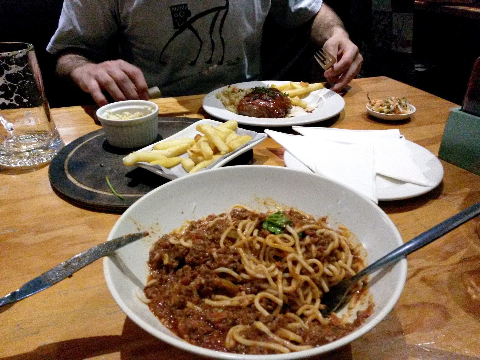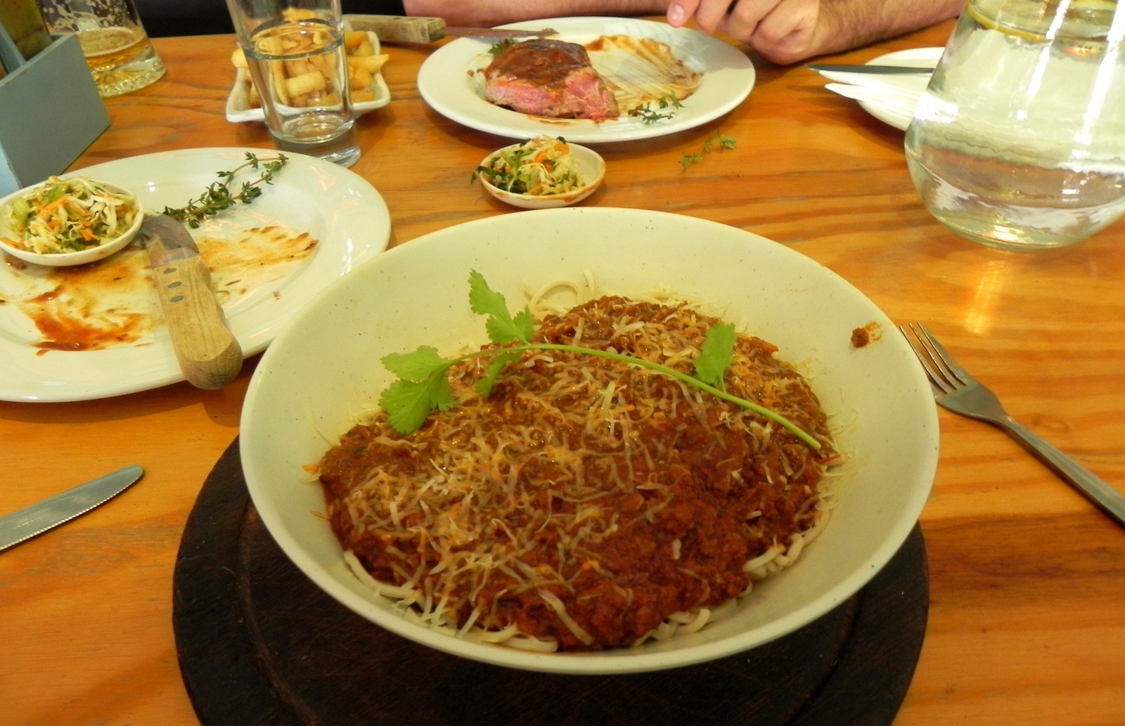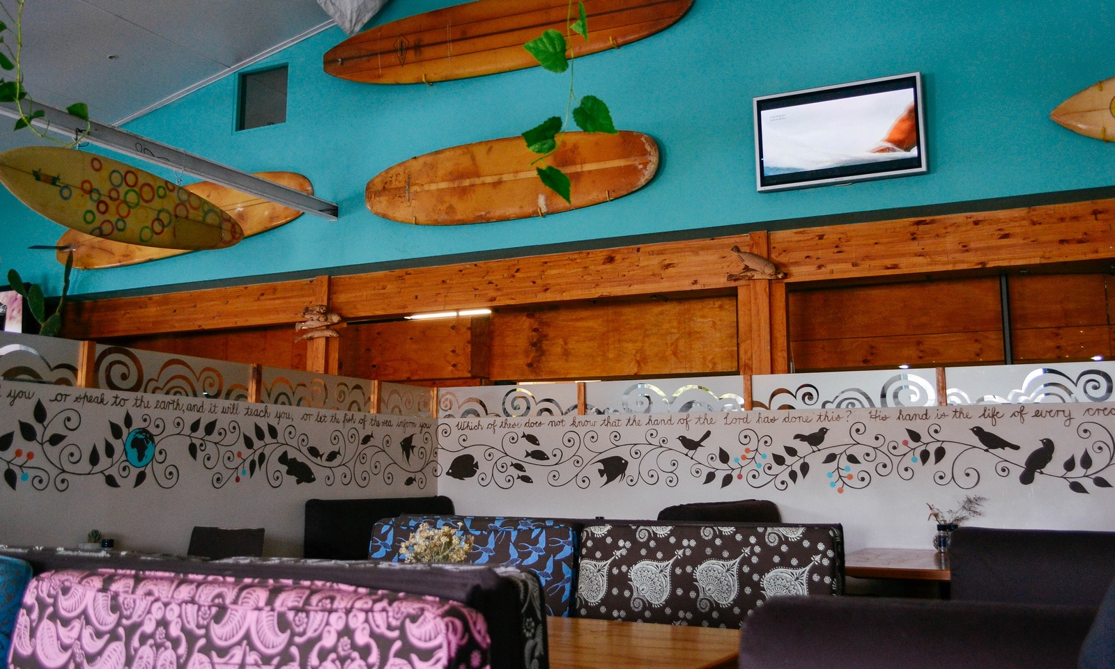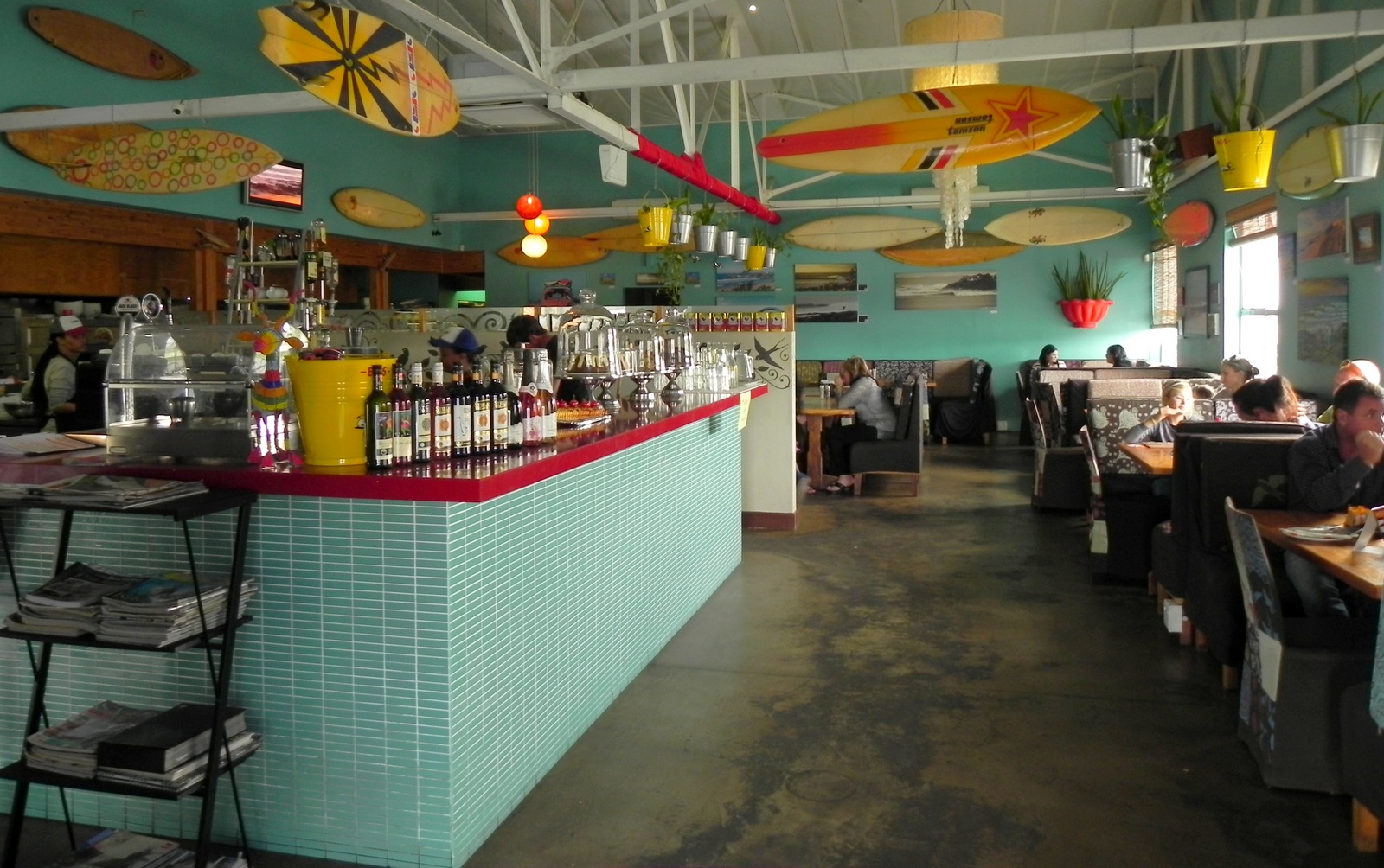 Neste dia, fizemos também uma descoberta importante em Jeffreys Bay: o restaurante Nina’s! Trata-se de um bar/restaurante na Gamma Road que é sem dúvida o rango mais confirmado de J-Bay! Lá eles servem diferentes tipos de café da manhã que você pode personalizar com o que deseja, uma variada carta de chopps e vinhos, pizzas maravilhosas, diversos pratos quentes espetaculares e um sorvete artesanal que é sacanagem! Além de a comida ser muito boa, o local tem também um visual bacana, com pranchas de surfe penduradas, quadros com imagens das ondas da região e está sempre rodando na TV um bom filme de surfe. Passamos a bater ponto lá quase todos os dias no almoço e janta!